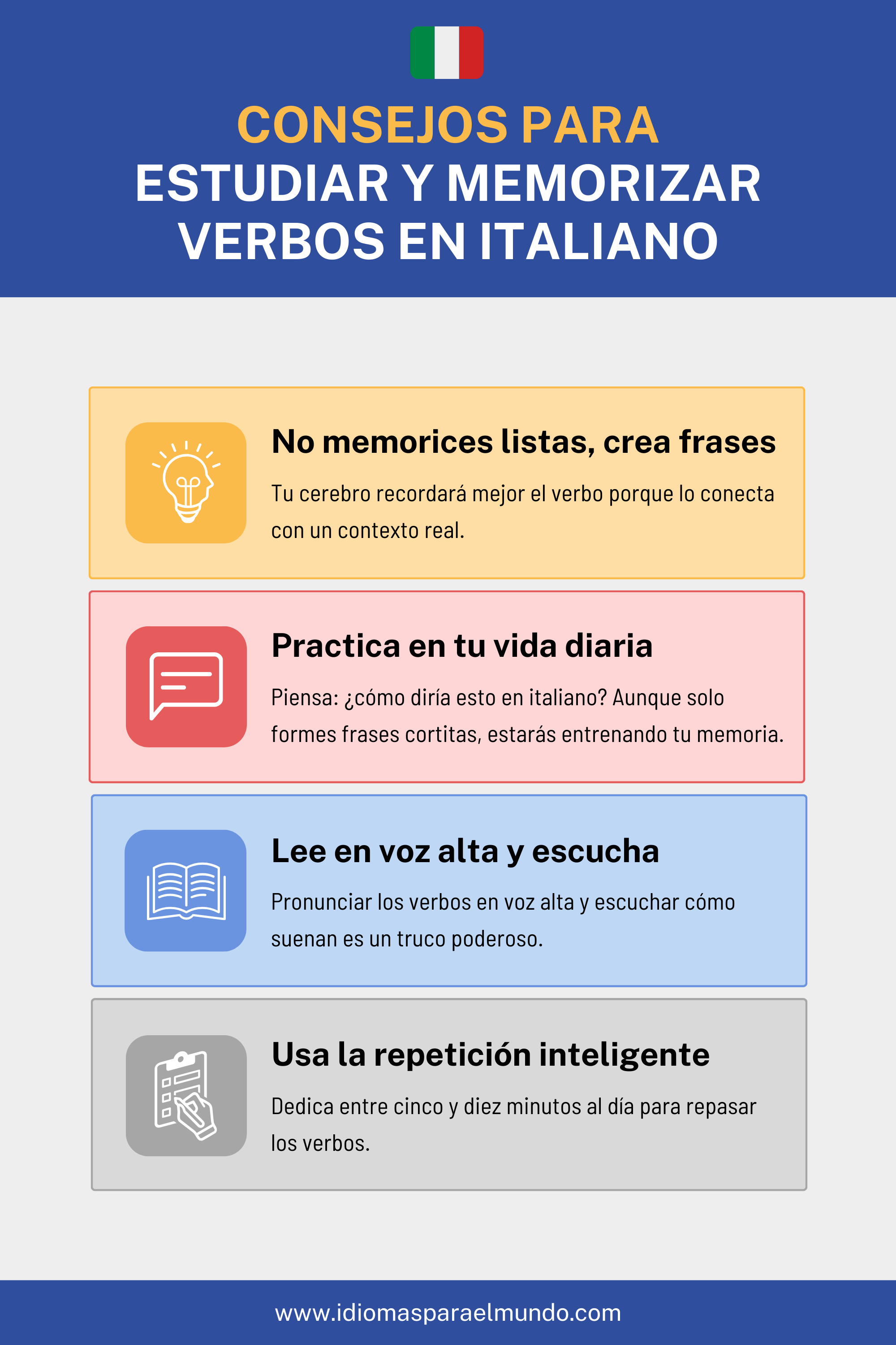 En este artículo ya viste los 100 verbos más usados en italiano y algunos ejemplos en presente, pasado y futuro, de algunos verbos. Con eso ya tienes una base sólida para empezar a comunicarte en tu día a día.